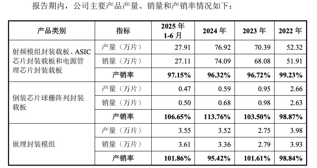 回复函显示,越亚半导体的主要产品中,射频模组封装载板是收入主力,报告期内收入分别为63708.71万元、105353.27万元、99665.67万元和37124.99万元,除了2023年同比增长65.37%外,2024年同比增速出现下滑,2025年上半年该产品收入只有2024年的37%,下滑较为明显。