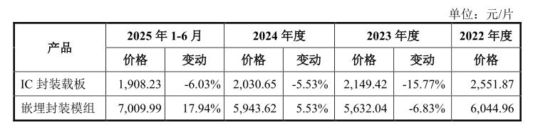 不难看出,2022年—2025年上半年,越亚半导体营收规模整体保持了稳定的增长,年复合增长率约为3.7%。然而,由于公司销售毛利率的大幅下滑,公司净利润出现了连续的缩水,过去三年期间降幅高达48.2%。其中,产品单价的走低成为越亚半导体毛利率持续下滑的一个主要原因。