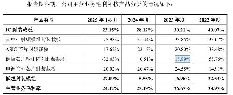 数据显示,报告期各期,IC封装载板平均价格分别为2551.87元/片、2149.42元/片、2030.65元/片、1908.23元/片,产品均价连续三年持续下行,对应同比降幅分别为15.77%、5.53%和6.03%.受产品单价下滑影响,报告期内越亚半导体几大细分产品毛利率均出现了明显下滑。其中,2022年-2024年,公司倒装芯片球栅阵列封装载板毛利率由58.76%下滑至0.51%,ASIC芯片封装载板毛利率由38.48%下滑至22.17%,嵌埋封装模组毛利率由32.53%下滑至5.55%。