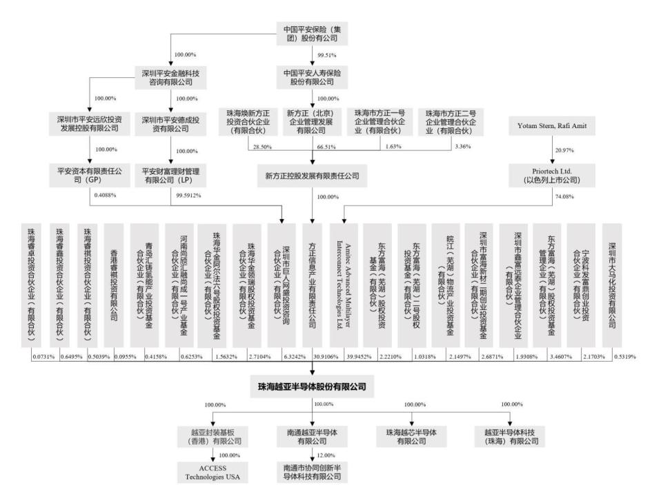 据悉,AMITEC公司是一家以色列上市公司Priortech所控股的境外企业,其实际控制人为RafiAmit和YotamStern。新信产及其一致行动人巨人网盛均是由中国平安最终控制的主体。由于第一大股东AMITEC公司和第二大股东新信产的股权比例接近且单个股东无法控制股东会或董事会多数席位,越亚半导体处于无控股股东、无实际控制人的状态。