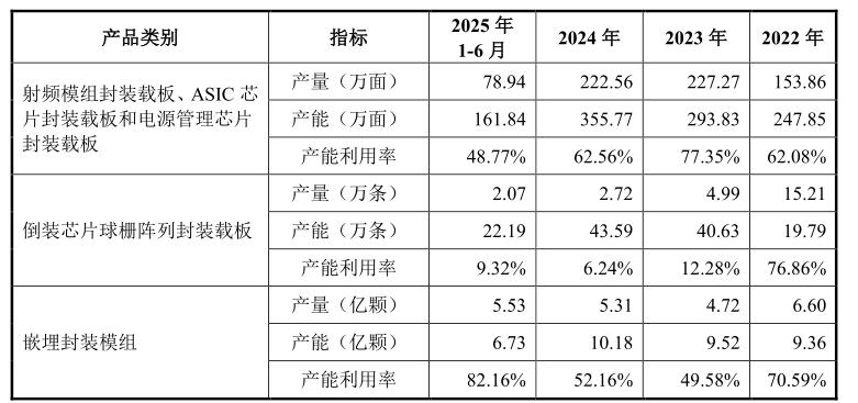 除了产品价格持续走低、毛利率暴跌之外,越亚半导体目前的产能利用率也不容乐观。截至2024年末,越亚半导体射频模组封装载板、ASIC芯片封装载板和电源管理芯片封装载板产能利用率约为62.56%,嵌埋封装模组产能利用率约为52.16%,倒装芯片球栅阵列封装载板产能利用率更是跌至6.24%。从2025年上半年来看,公司ASIC芯片封装载板和电源管理芯片封装载板产能利用率进一步跌至48.77%,倒装芯片球栅阵列封装载板产能利用率仅为9.32%。