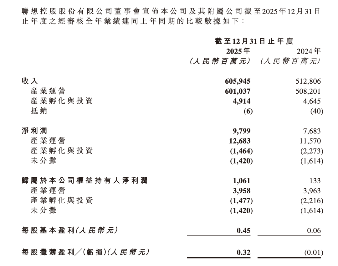 回顾联想控股此前公布的2025年年度的全年业绩。在过去一年,其实现收入人民币6059.45亿元,同比增长18%,增长主要源于产业运营板块的联想集团收入大幅提升。净利润达人民币97.99亿元,同比增长28%;归属于本公司权益持有人净利润同比增长698%,达人民币10.61亿元,利润增长得益于产业孵化与投资板块业务亏损同比减少。