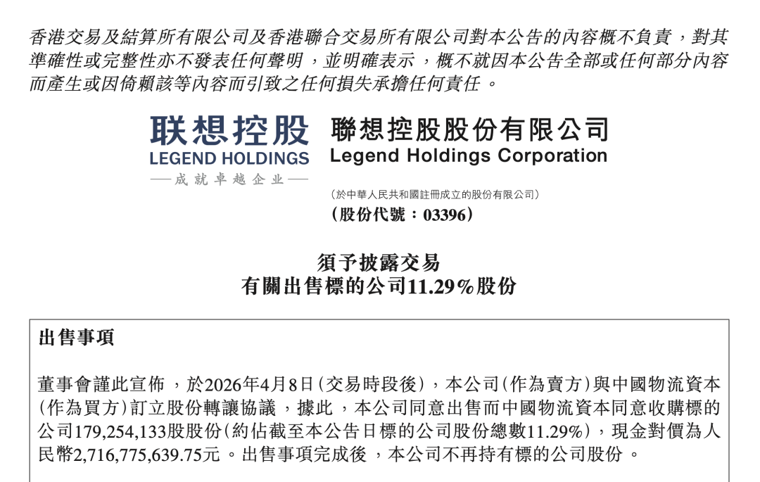 4月9日消息,联想控股股份有限公司发布公告。公告显示,在2026年4月8日交易时段结束后,联想控股作为卖方与买方中国物流资本订立股份转让协议,将出售标的公司179,254,133股股份,约占标的公司股份总数的11.29%,交易现金对价高达人民币27.17亿元。交易完成后,联想控股将彻底退出对该标的公司的持股。