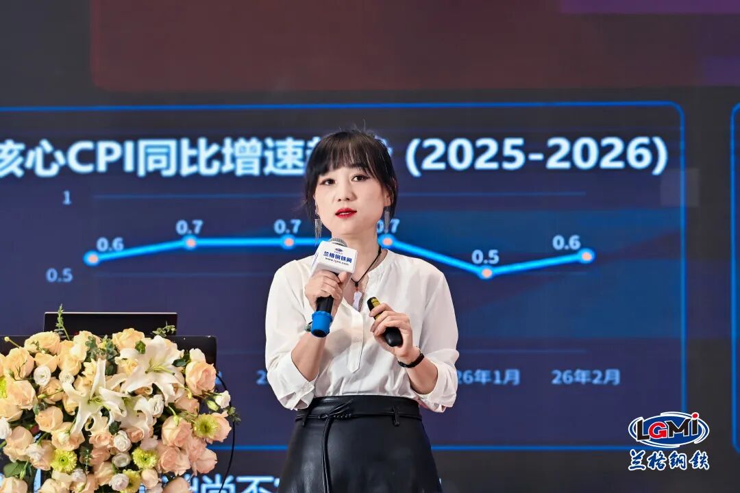 兰格钢铁网主编王思雅在题为《地缘冲突下的黑色系困局与博弈》的主题演讲中指出,当前中国经济面临复杂的“类滞胀”环境,内需不足与地缘政治引发的成本上涨双向挤压,弱复苏特征明显。她重点剖析了地缘冲突对大宗商品的深远影响,认为霍尔木兹海峡对峙使能源成本中枢永久性上移,输入性通胀压力持续加大。她还从供应、库存、需求、成本等环节解读了黑色系博弈逻辑,预判2026年钢铁行业将迎来“减产、提质、转型”的关键窗口期,并提醒关注政策预期与现实需求之间的节奏错配风险。