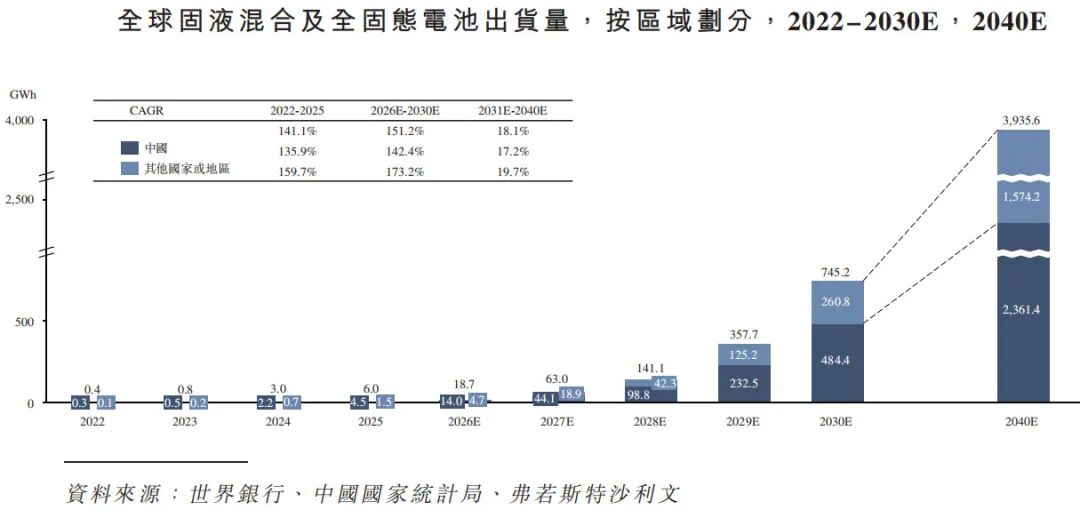 据弗若斯特沙利文数据,全球固液混合及全固态电池出货量,从2022年的0.4GWh飙升至2025年的6.0GWh,预计2030年前将爆发式增长。
