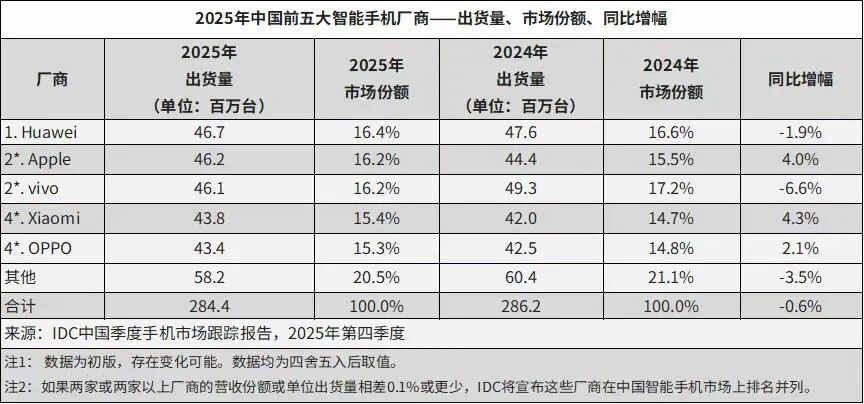 IDC数据显示,2025年中国智能手机市场出货量约2.85亿台,同比微降0.6%。其中,华为以4670万台的出货量重登榜首。而作为“华为平替”的荣耀,则第一次跌出国内前五,沦为“Others”阵营。