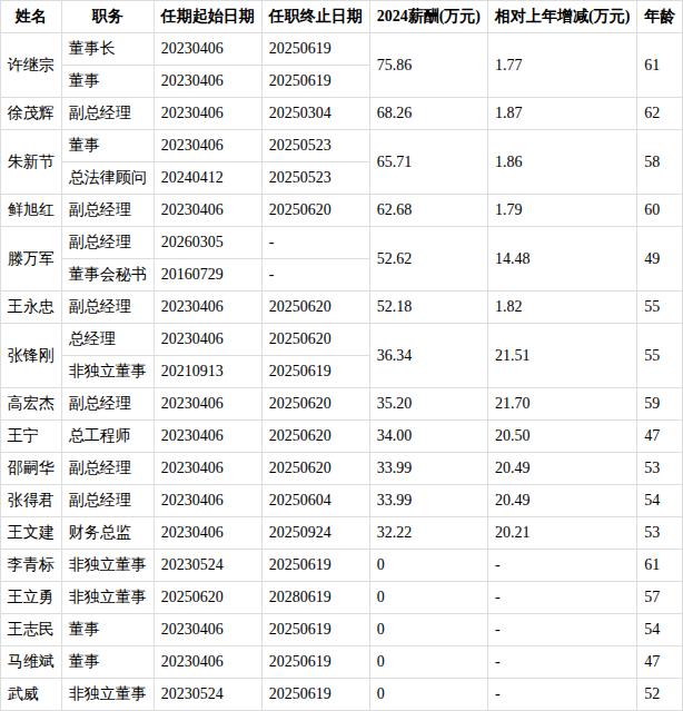 根据2024年报数据,剔除独立董事、监事会主席、监事后,甘肃能化共有17位董事和高级管理人员。从年龄看,甘肃能化董事和高级管理人员平均年龄为55岁,年龄中位数为55岁,其中,副总经理徐茂辉年龄最高为62岁,总工程师王宁年龄最小为47岁。从薪酬看,董事和高级管理人员合计领取报酬583.05万元,平均薪酬48.59万元,年薪中位数为44.26万元。其中,董事长及董事许继宗薪酬最高为75.86万元,财务总监王文建薪酬最低为32.22万元(2024年任期不满1年的不参与统计)。