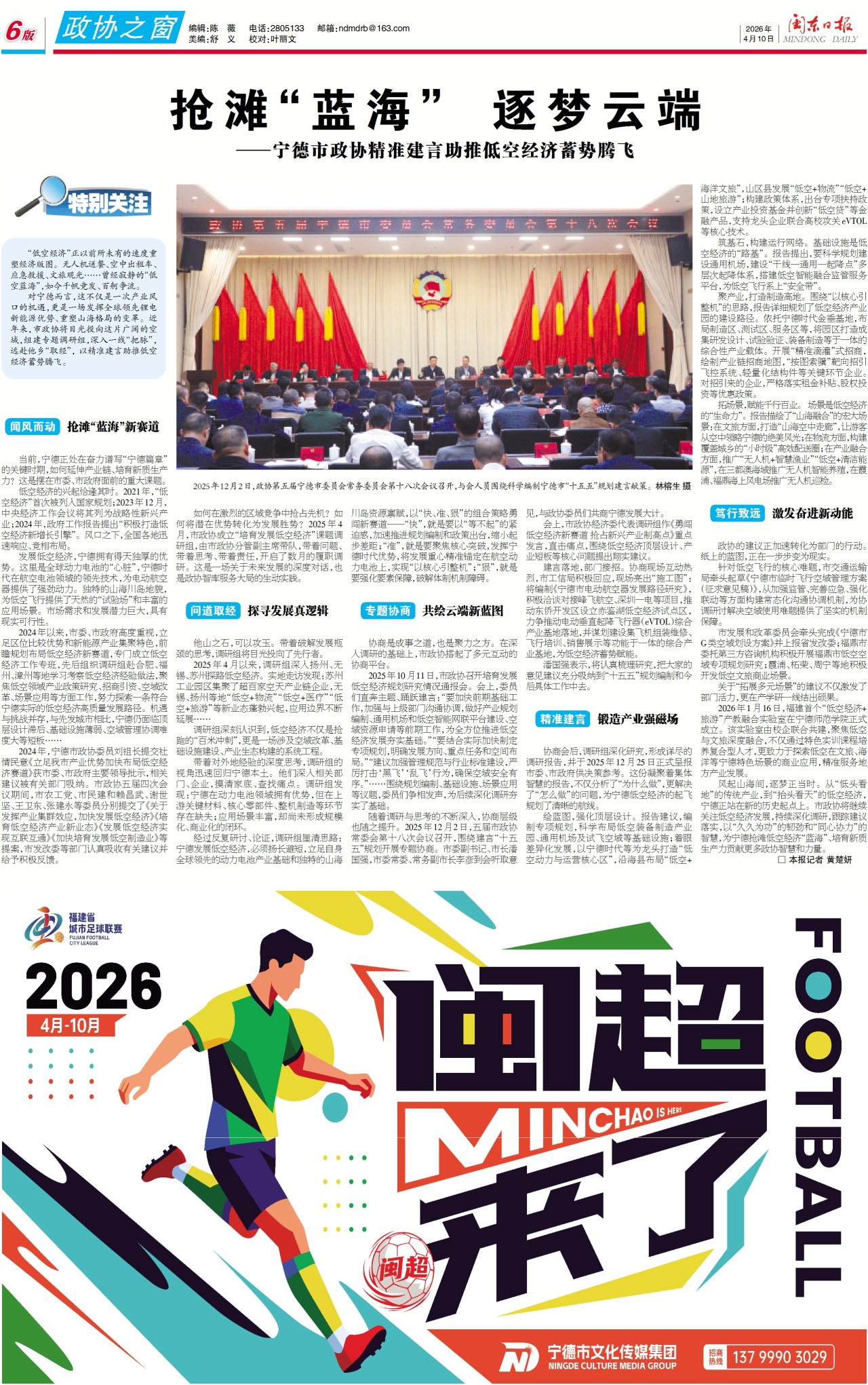 风起山海间,逐梦正当时。从“低头看地”的传统产业,到“抬头看天”的低空经济,宁德正站在新的历史起点上。市政协将继续关注低空经济发展,持续深化调研,跟踪建议落实,以“久久为功”的韧劲和“同心协力”的智慧,为宁德抢滩低空经济“蓝海”、培育新质生产力贡献更多政协智慧和力量。