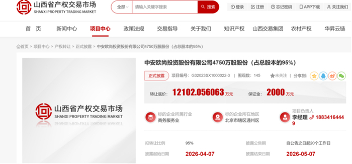 4月7日,山西省产权交易市场显示,潞安化工集团拟转让中安欧尚投资股份有限公司(以下简称“中安欧尚”)4750万股股份(占总股本的95%),转让底价为1.21亿元。