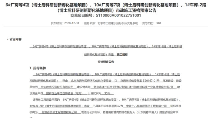 北京市公共资源交易服务平台显示,中安欧尚曾在北京开发“博士后科研创新孵化基地项目”。