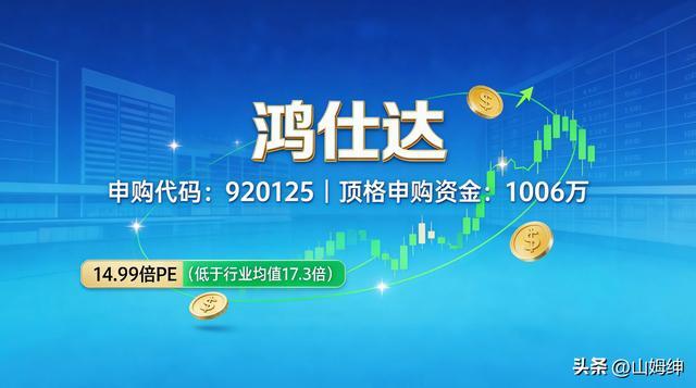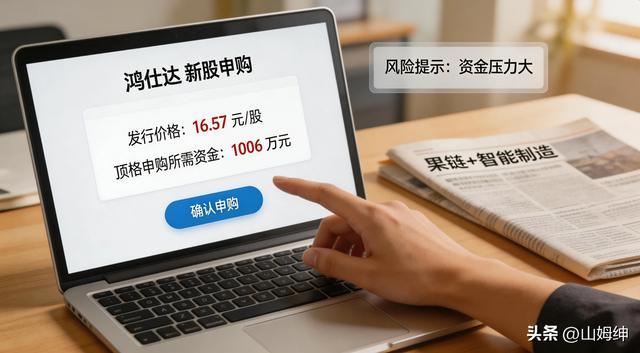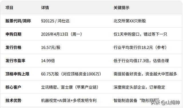4月13日(周一)北交所将迎来一只“果链+智能制造”双概念新股——鸿仕达(920125)。不少投资者好奇:这只新股发行价16.57元,顶格申购需约1006万元,收益能有多少?破发风险大不大?本文从核心数据、行业潜力、风险提示三方面拆解,帮你看清这只“肉签”是否值得参与!