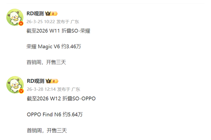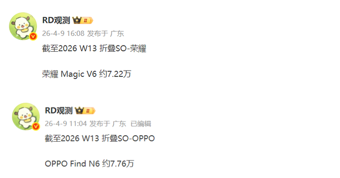 那么在现实中荣耀Magic V6与OPPO Find N6谁更受市场欢迎呢?来自行业人士“RD观测”的数据显示,截至2026年W13周荣耀Magic V6的累计销量约为7.22万台,而OPPO Find N6的累计销量约为7.76万台。需要说明的是荣耀Magic V6是3月13日正式开售的,OPPO Find N6是3月20日正式开售的。二者发售时间还是有一定区别的,目前来看是OPPO Find N6更受欢迎一些,毕竟整体销量比荣耀Magic V6多0.54万台,但考虑到荣耀Magic V6自开售以来最受欢迎的版本一直缺货,所以不能简单的对比累计销量。