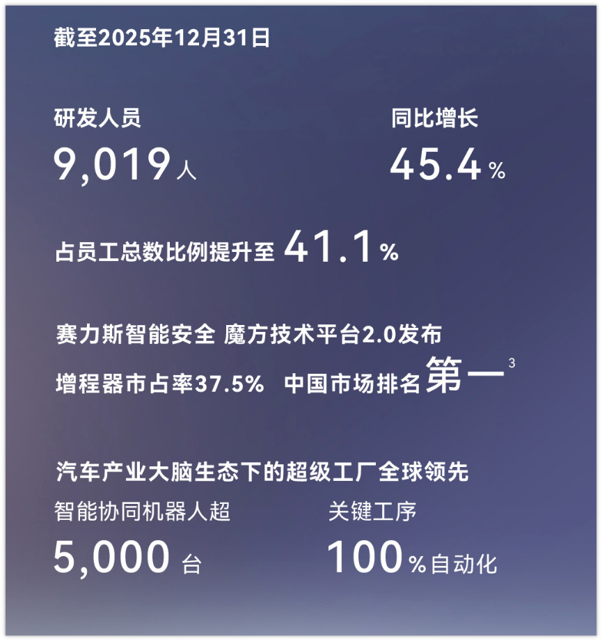 2025年,赛力斯的研发投入飙升至125.1亿元,同比激增77.4%,研发人员猛增2800余人。