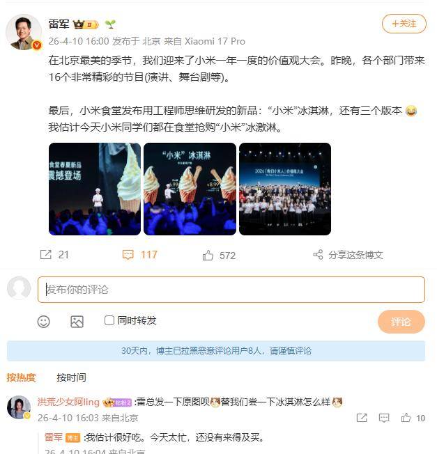 4月10日下午,小米CEO雷军发文表示:“我估计今天小米同学们都在食堂抢购‘小米’冰淇淋。”在回复网友时,他写道:“估计很好吃。今天太忙,还没顾上买。”