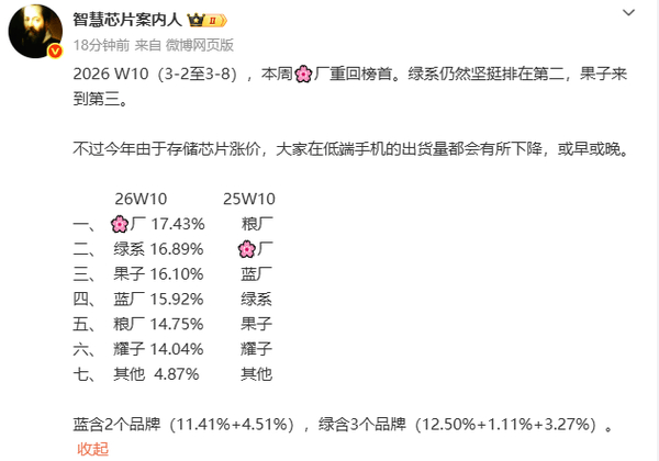 3月13日,CNMO注意到,有博主透露了2026年第10周的中国智能手机市场销量及份额排名: