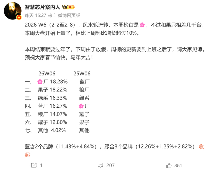 最近,有自媒体给出了2026年第六周的国内手机销量情况,看了下,总体变化不大,第一名再次易主,从苹果变成了华为,而三到六名变化不大。