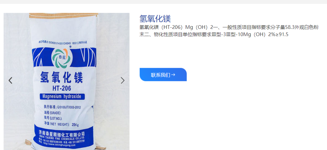 公司主营硼酸锌、氢氧化铝、三聚氰胺氰尿酸盐(MCA )、次磷酸盐、氢氧化镁、聚磷酸铵、三氧化二锑以及专用无卤阻燃剂的研发、生产、销售。公司氢氧化镁产品参数如下: