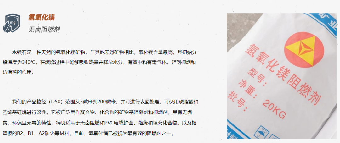 公司专业生产氢氧化镁阻燃剂及相关产品,核心产品线包括氢氧化镁阻燃剂:应用于CPE、EVA、阻燃铝塑板、阻燃母料等领域;矿物质防火泥:BTLY、BBTRZ防火电缆专用填充材料;氧化镁粉:BTTZ刚性防火电缆专用;阻燃母粒及其他阻燃产品。