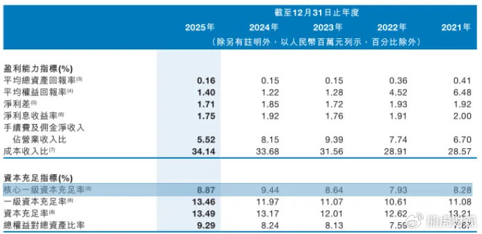 时间截止至2025年末,九江银行的核心一级资本充足率已降至8.87%,虽然的确高于监管要求的7.5%红线,但安全垫已十分薄弱。