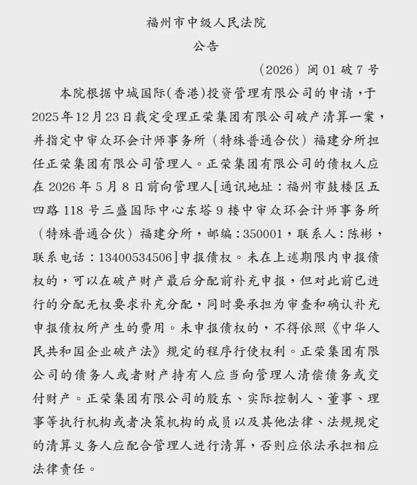 据福州市中级人民法院近日发布的公告,根据中城国际(香港)投资管理有限公司的申请,法院于2025年12月23日裁定受理正荣集团有限公司破产清算一案,并指定中审众环会计师事务所(特殊普通合伙)福建分所担任正荣集团有限公司管理人。