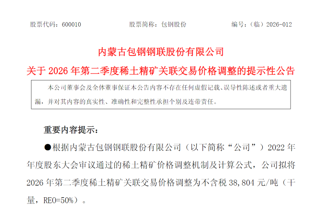 据包钢股份公告,根据公司2022年年度股东大会审议通过的稀土精矿价格调整机制及计算公式,结合2026年第一季度稀土氧化物市场价格,公司拟将2026年第二季度稀土精矿关联交易价格调整为不含税38804元/吨(干量,REO=50%)。若REO含量每增减1%,不含税价格相应增减766.08元/吨。