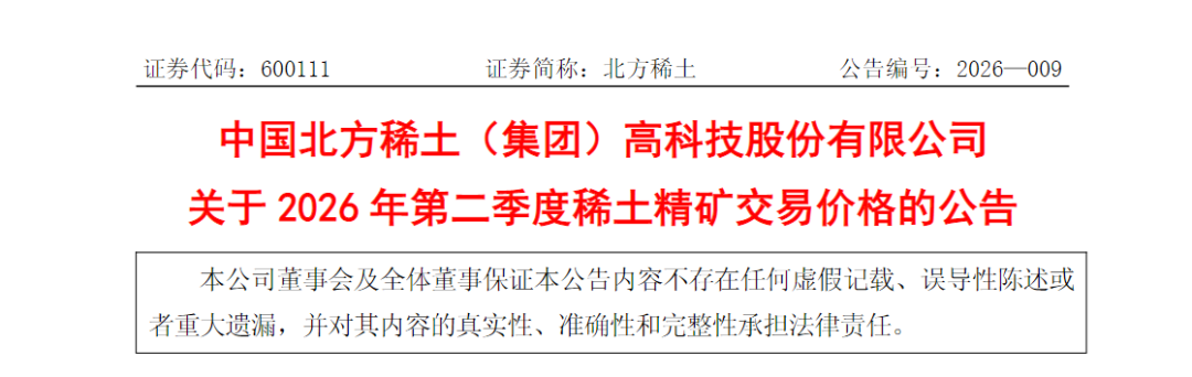 北方稀土同日公告,根据稀土精矿定价方法及2026年第一季度稀土氧化物价格,经测算并经公司2026年第6次总经理办公会审议通过,2026年第二季度稀土精矿交易价格调整为不含税38804元/吨(干量,REO=50%)。REO每增减1%,不含税价格相应增减776.08元/吨。