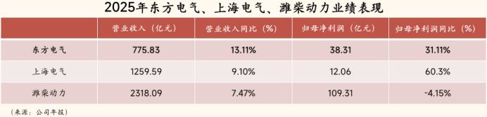 2025年,东方电气的业绩率先突出重围。其全年营收、净利润分别为775.93亿元、38.31亿,同比均实现两位数的正增长,走在了上海电气、潍柴动力的前面。