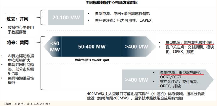 据调查,当数据中心规模在50-400MW时,潍柴动力等企业制造的燃气发电机还有一定市场。然而,当数据中心规模大于400MW时,重型燃气轮机就成了可预见的最理想发电方式。
