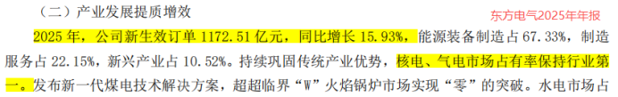 反观东方电气,加上2025年新增的1172.51亿订单,公司在手订单额已高达1403.1亿元。其中,气电国内市占率高居第一,成为继煤电、风电之后的第三大营收来源。