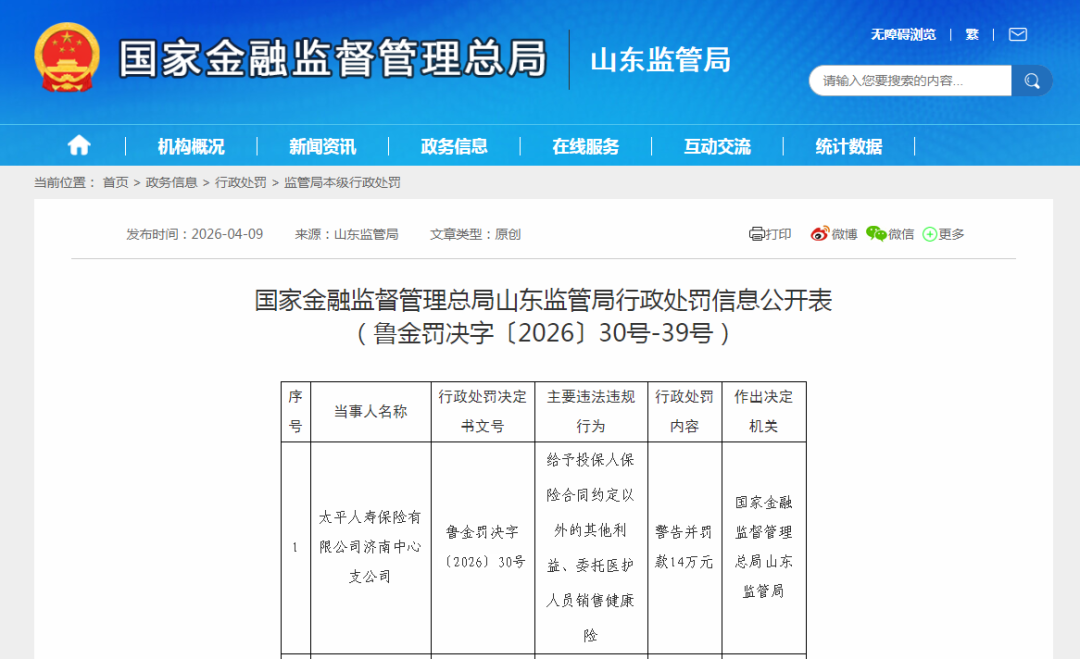 太平人寿济南中心支公司因给予投保人保险合同约定以外的其他利益、委托医护人员销售健康险被警告并罚款14万元。