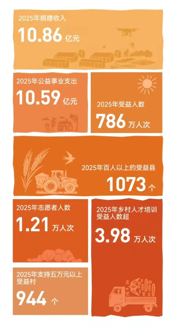 最新年报显示,乡基会2025年共接收捐赠款物10.86亿元,公益事业支出10.59亿元,均较上一年略有下降。