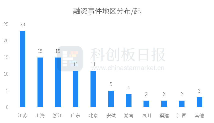 从地区来看,本周江苏、上海、浙江、广东、北京等地公司较受青睐,融资事件数均在10起以上;江苏以23起融资活跃度居首位。从单个城市看,上海有15家公司获投,位列第一;杭州紧随其后,有12家公司获投。