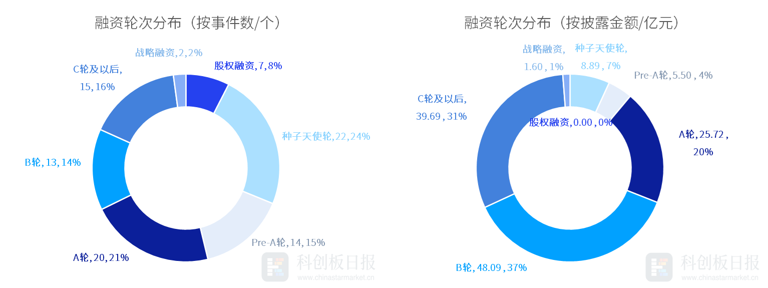 从投资轮次来看,除股权融资外,本周种子天使轮融资事件数最多,发生22起,占比约24%;其次是A轮,发生20起,占比超21%。从各轮次获投金额来看,B轮披露的融资总额最高,约48.09亿元;其次是C轮及以后,约39.69亿元。