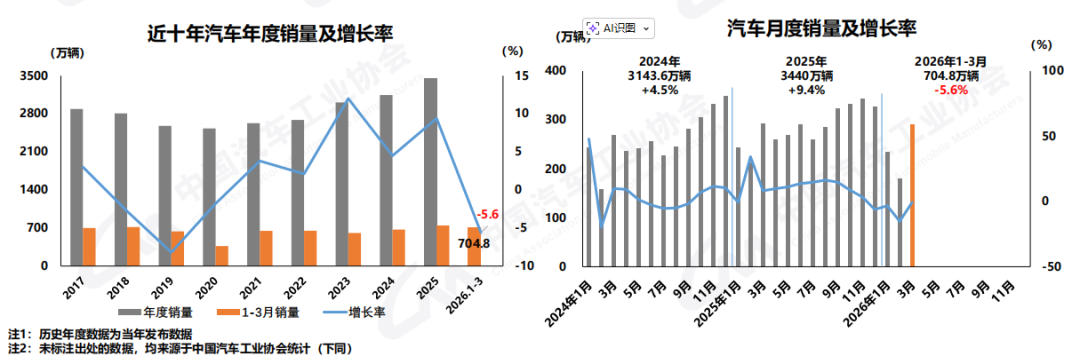 将三个月的数据贯通来看,2026年一季度,汽车产销分别完成703.9万辆和704.8万辆,同比分别下降6.9%和5.6%。