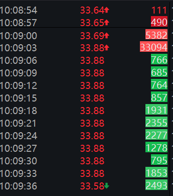 成交明细显示,4月10日,多空双方围绕西藏矿业持续博弈。开盘后,该股的买入量明显增加,9点30分合计买入近1.19万手,买方力量强劲,当天10:09:03更是出现一笔显著的集中买单,达3.31万手,以33.88元/股成交,推动股价封板。