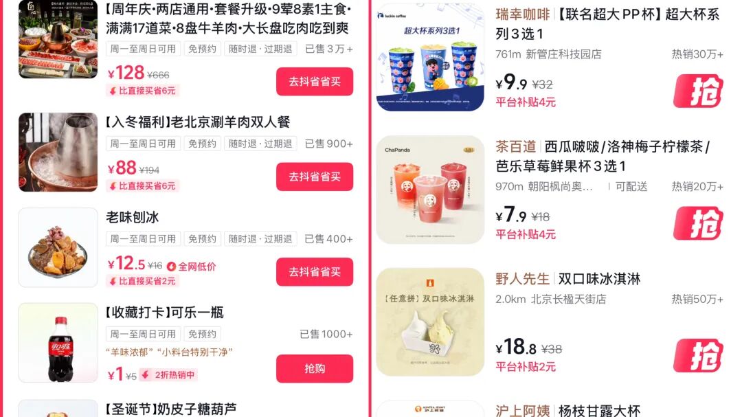 到店团购。抖音推出“抖省省”独立App,京东团购覆盖百城百万餐厅,淘宝闪购携近十亿流量入局……
