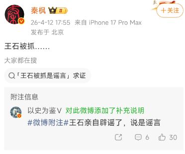 “王石被抓”,四个字,没有前因后果,没有证据链,甚至连消息来源都没交代。但就是这么一句话,在2026年4月12日下午,迅速冲上热搜。