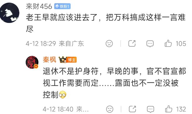 秦枫那条微博的评论区也很有意思。有人质疑她没证据,她回复:为啥不能抓?给万科造成了那么大损失。
