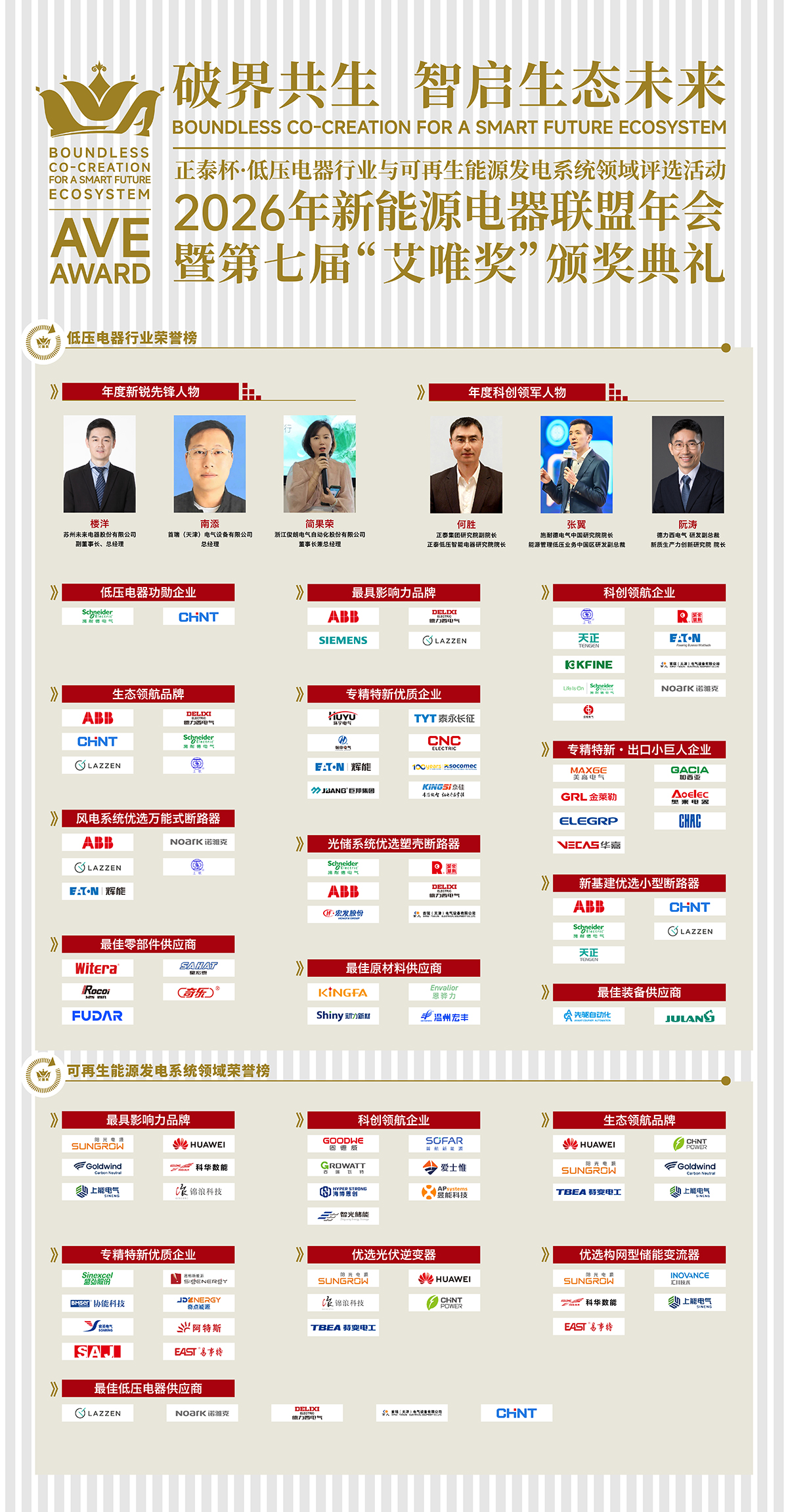 现场,历经八个月严谨遴选,经过企业申报、网络投票、百名专家评审、第三方机构及头部企业推荐、核心专家终评五大环节,各大奖项榜单正式诞生。本届“艾唯奖”设置功勋、人物、品牌、产品、供应商五大类别,全面覆盖低压电器与可再生能源发电系统两大领域,旨在表彰行业标杆、领军人才及创新成果。