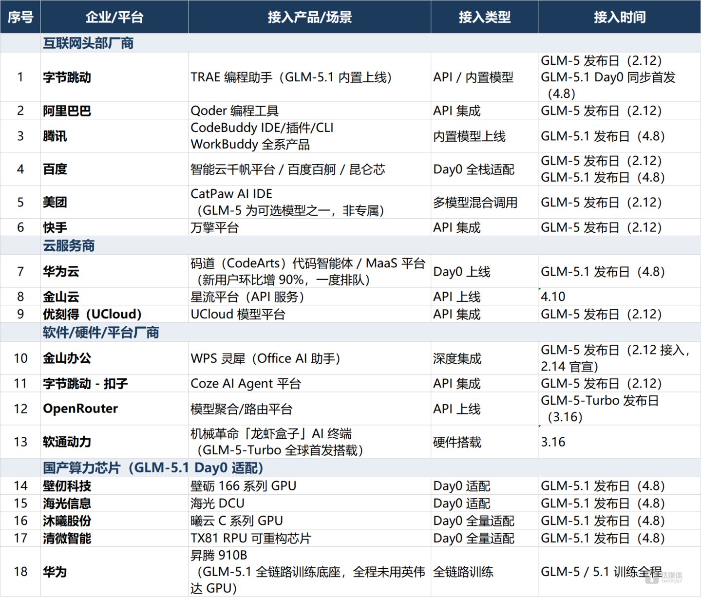 据公开信息可查证,GLM-5系列已获得至少18家企业的公开接入或适配官宣,覆盖四个层级: