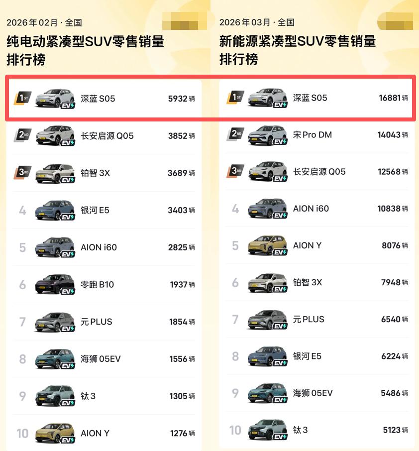 其中,深蓝S05作为一款面向全球市场的紧凑级SUV,在2月和3月连续两个月成为了该细分品类中的销冠,自上市以来月均销量破万。而且,这款车已经在全球70多个国家和地区上市,全球累计销量超19万辆。