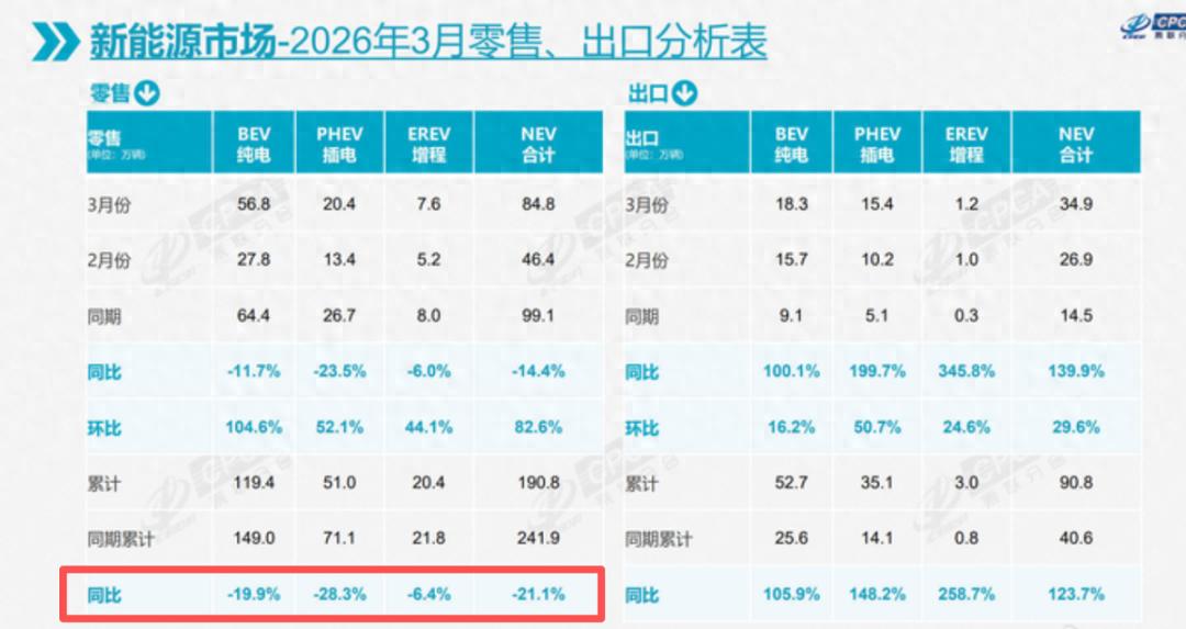根据乘联会统计,2026年第一季度,国内新能源乘用车零售量为190.8万辆,同比去年下滑了21.1%,这一数据高于整体乘用车市场17.4%的下滑幅度。