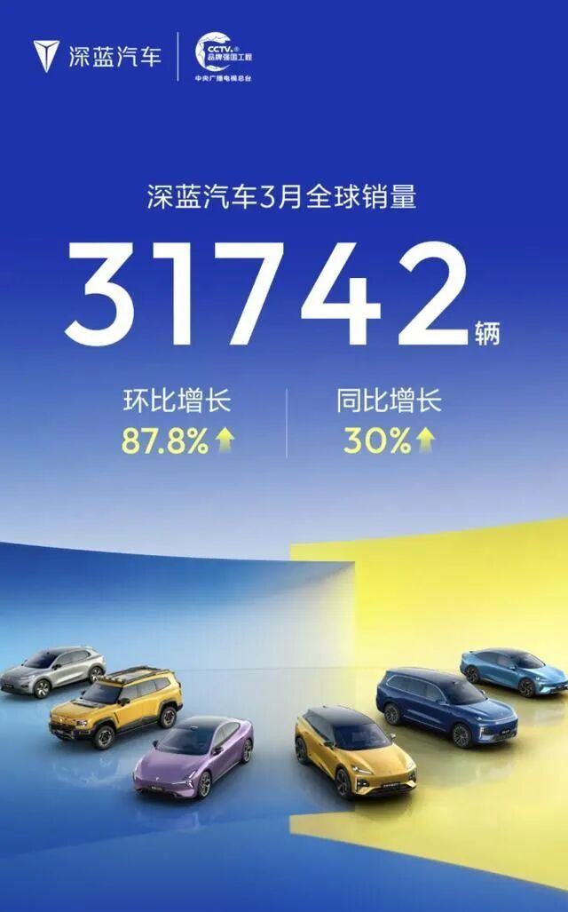 今年3月,深蓝以全球总销量31742辆的成绩,实现了同比增长30%,环比增长87.8%。