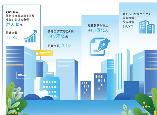 截至2025年末,工行制造业贷款余额突破5.2万亿元、同比增长近20%。建行投向战略性新兴产业贷款同比增长23.46%,投向京津冀、长三角、粤港澳大湾区等重点区域的贷款保持良好增长态势。农行县域贷款占境内贷款比重超过40%,年增量连续4年超过万亿元。交行养老产业贷款增幅接近50%。邮储银行养老金金融规模超3.5万亿元。