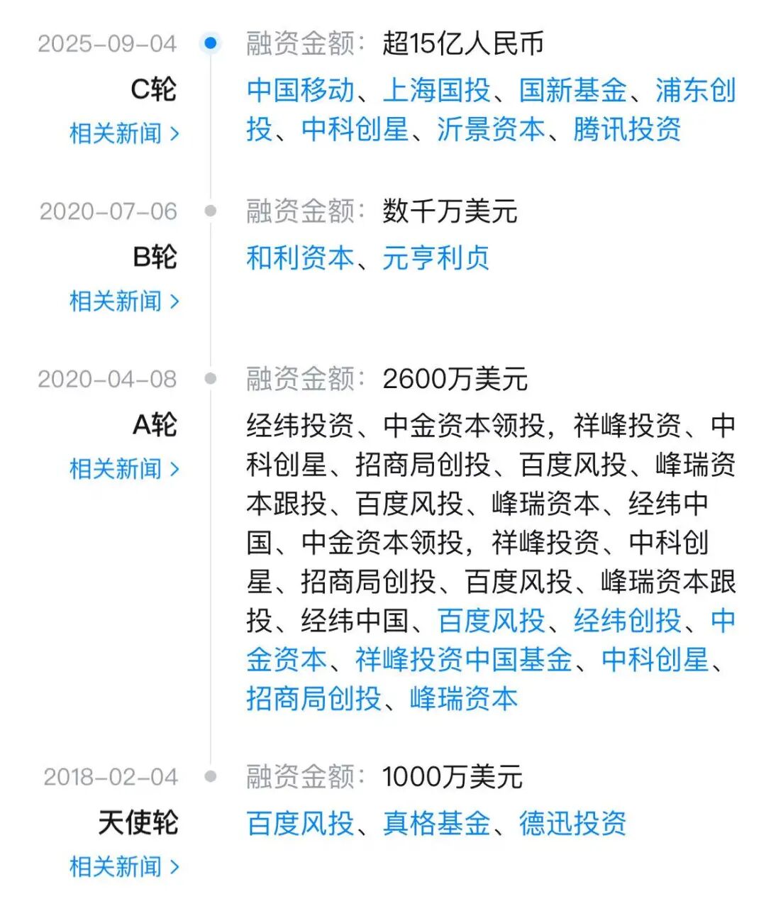 2021年完成B轮融资。2025年9月,完成超15亿元人民币C轮融资,投资方包括上海国投、浦东创投、中国移动、腾讯、中科创星等。
