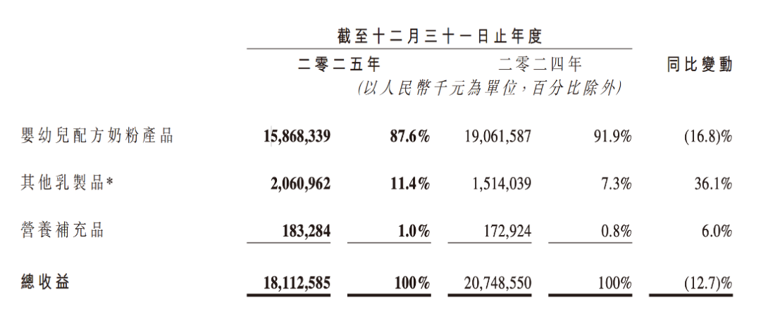 2025年的财报数据显示,飞鹤旗下的三块业务分别为婴幼儿配方奶粉产品、其他乳制品以及营养补充品。其中,婴幼儿配方奶粉2025年的销售额为158.7亿元,占飞鹤总营收的91.9%。