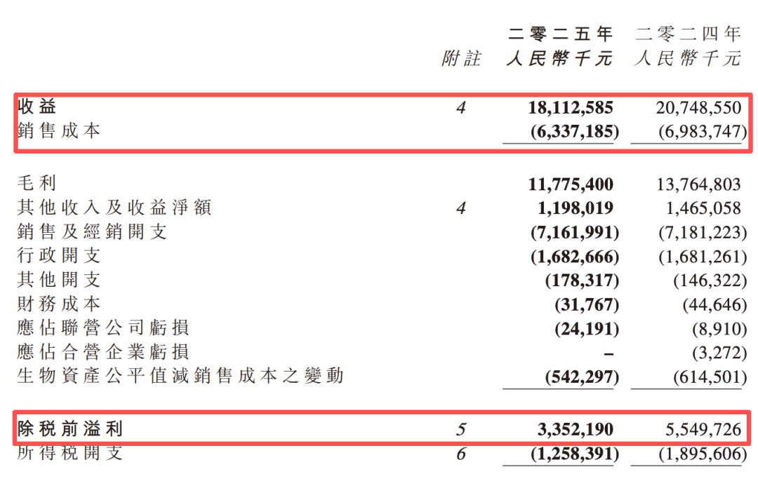 当飞鹤营收出现约26亿元的下滑时,销售成本只降低了6.5亿元,成本下降幅度极其有限,而高昂的刚性费用无法同步缩减,导致营收下滑带来的毛利损失被直接且等额地传导至底线利润,最终造成除税前溢利出现了约22亿元的同级别剧烈收缩。