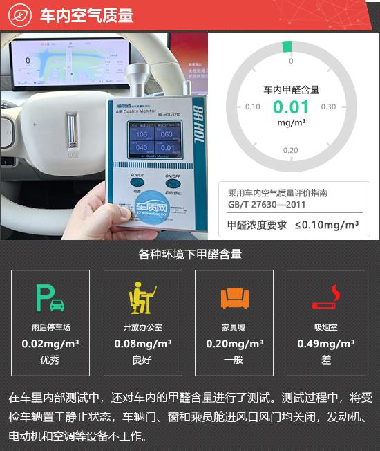 在车内空气质量测试环节,将车辆放置在车辆较少的内部地面停车场中,实测 2025 款魏牌高山 8 的车内甲醛含量为 0.01mg/m3,符合 2012 年 3 月 1 日起实施的,由原环保部和国家质量监督检验检疫总局联合发布的《乘用车内空气质量评价指南》(中华人民共和国国家标准 GB/T 27630-2011)中的相关标准。