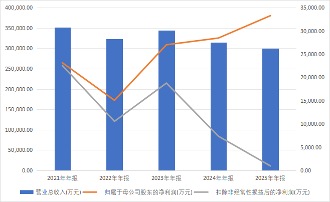 反映在数据上,就是营收的连续下滑。2023年34.45亿元,2024年31.40亿元,2025年30.04亿元,三年间营收萎缩超过12%。
