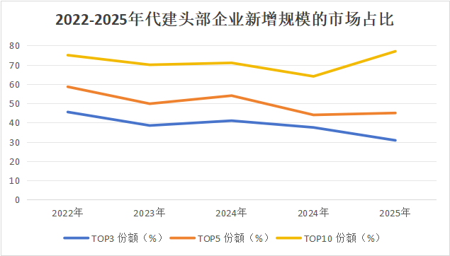 2025年新签订单有77%集中在规模TOP10企业的手里,同比2024年集中度又提高6个百分点。其中,TOP5企业就拿走了45%的份额。
